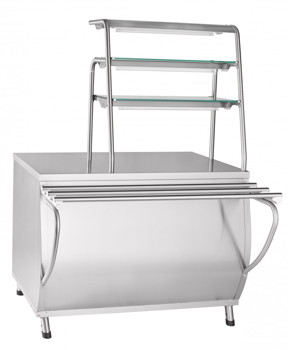 Линия ПРЕМЬЕР. 2 розетки 220В, 3 полки длиной 752мм с подсветкой, защитное стекло, нейтральный шкаф с дверцами, направляющие для подносов, нерж. сталь, глубина модуля 766мм