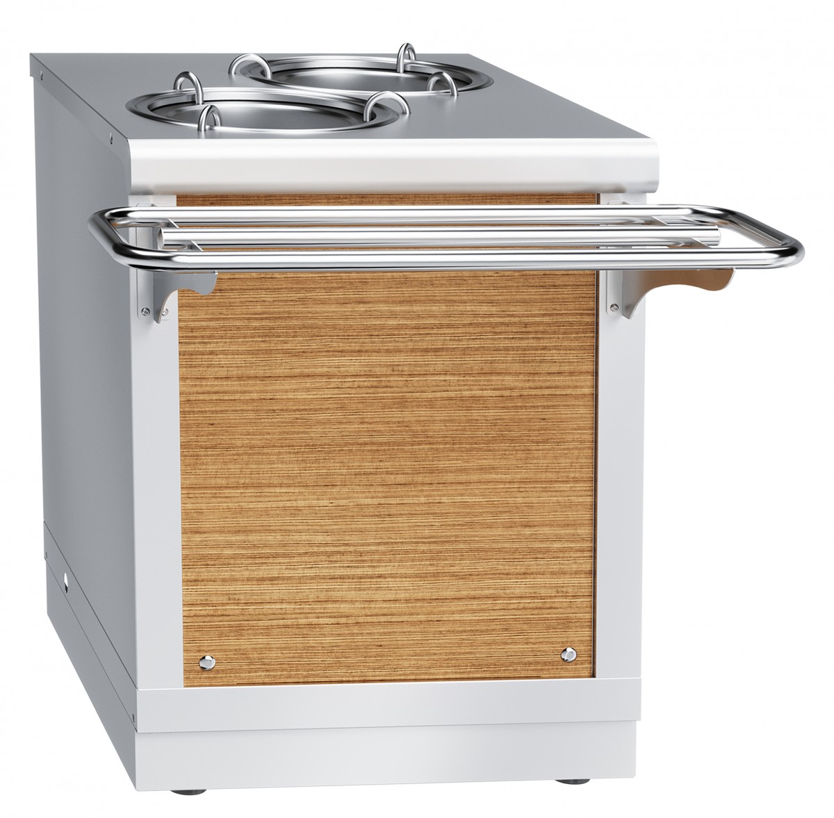 5 вариантов съемных панелей: орех, дуб, вишня, красное золото или нержавеющая сталь, панели легко снимаются и так же легко закрепляются на 4-х декоративных винтах, направляющие без стыков - мы позаботились о качестве сервиса в Вашем кафе: супы и напитки не прольются во время движения подноса (идут в комплекте), цоколь по нижнему краю закрывает просвет от пола до корпуса элементов - пыль не скапливается под изделиями, регулируемые по высоте ножки.